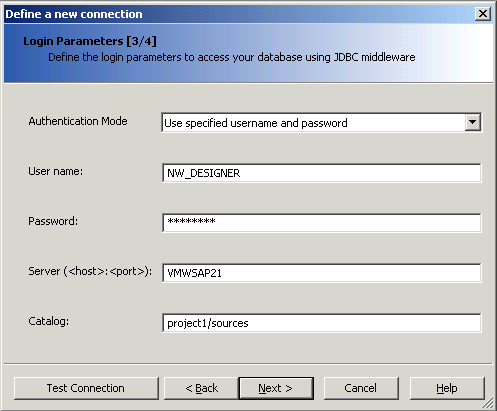 For the Authentication Mode, you can choose between the Use specified username and password option or the Use BusinessObjects credential mapping option. In this example you want to configure the connection with SAP BusinessObjects credential mapping, so you need to log on to the Universe Designer with the SAP BusinessObjects Enterprise credentials in place.
