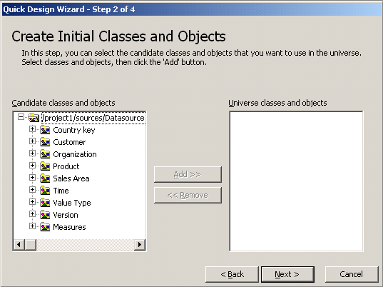 Step 9. You are presented with a list of classes, dimensions, and detail objects. Select which object you would like to include in your universe (Figure 25). Click the Add button to move them to the Universe classes and objects list. Click the Next button, and then click the Finish button.