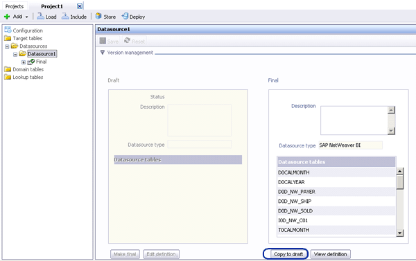 Step 9. Open the Data Federator project and navigate to the data source of your project (Figure 28). Click the Copy to draft button so that you can change the definition.