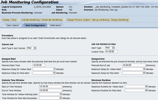 With the help of BPM, you can monitor your scheduled and productive jobs. By using the Monitoring button in Figure 12, you can also maintain and activate BPM in the job documentation without the need to go to the BPM setup session in SAP Solution Manager. Define your alert criteria for yellow and red alerts and the way you want to be notified (e.g., via mail or service desk message) (Figure 14).
