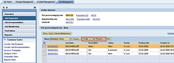 Now that you have basic documentation in SAP Solution Manager, you can manage new requests using the Web form provided by JSM (rather than creating customer inquires which can be time consuming). This form is the standard vehicle for requesting new jobs, adjusting existing jobs, or deleting old jobs. Open the Web form in a browser window by clicking the Create Job Request common task in the JSM work center (Figure 3). Here you maintain your job request data via a browser-based message.