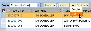 To create a new change request or to display or edit an existing job documentation entry, switch to the Job Management tab, and then mark the change request, or documentation, and edit it. For example, click on Transaction ID 8000002647, which enables the Job Request button, and then click on Edit from the drop-down menu (Figure 7).
