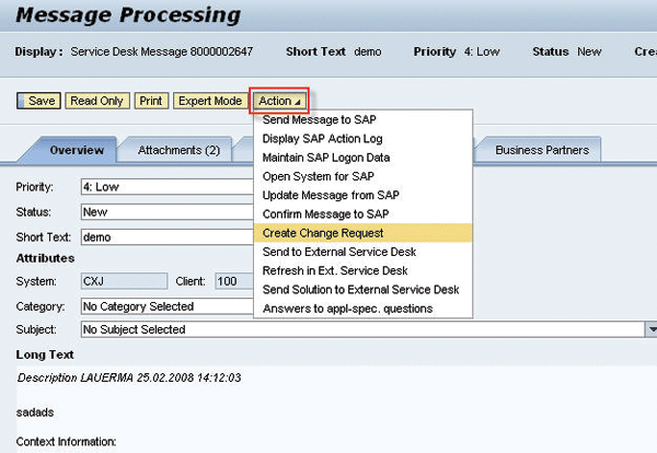Editing a job request occurs in the Service Desk of SAP Solution Manager. Click the Action button, and in the drop-down menu, you find the transaction types and dedicated actions associated with the job request that you selected, from updating a job request to creating a change request (Figure 8).