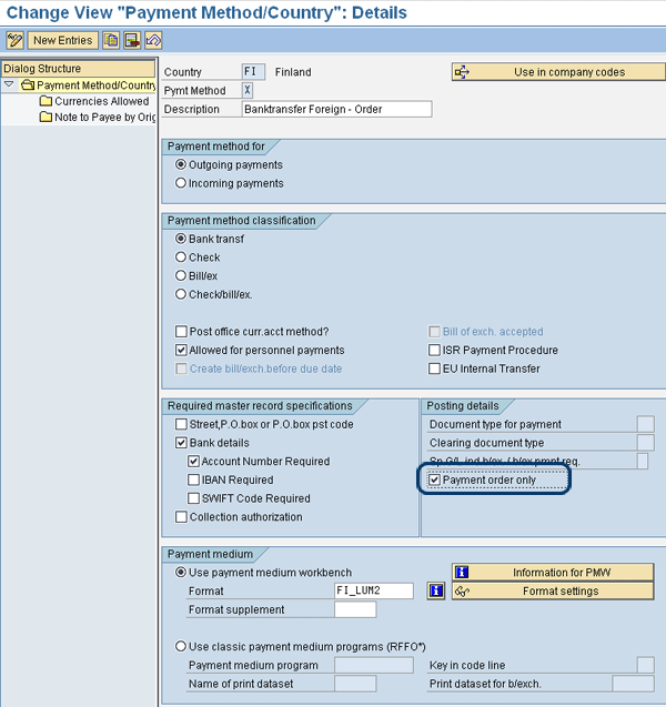 Start the configuration menu of the SAP system and follow menu path Financial Accounting > Accounts receivable and Accounts Payable > Business Transactions > Outgoing Payments > Automatic Outgoing Payments > Payment Method/Bank Selection for Payment Program > Set Up Payment Methods per Country for Payment Transactions. Alternatively, you can also start transaction code FBZP and choose the option Pmnt methods in country. Figure 1 shows the fields for the payment methods per country. In the Posting details window, you can set the Payment order only box. As soon as you set the indicator, the other fields in the window will be cleared and cannot be changed. You can only set the indicator for Bank transf (Outgoing payments) and debit memo (Incoming payments).
