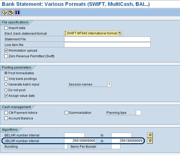 To import the electronic bank statement in the SAP system, use transaction FF_5. Note that it is important that you enter the XBLNR number interval correctly (Figure 11). The number interval must always be entered using ZR as a prefix. An example is shown in Figure 11. The number range used for payment orders runs from 100000000 to 199999999. This example number range is only nine digits; however, it is required to have numbers that are 10 digits. Therefore, leading zeroes must be added to ensure that the number interval always has 10 digits. So in this case one leading zero must be added to reach 10 digits. In this example the XBLNR number interval looks like ZR0100000000 up to ZR0199999999.