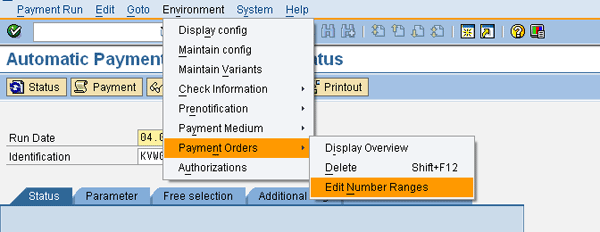 When you create a payment order, the system creates a document for each payment order. To enable that functionality, you need to create number ranges for the payment orders. This is not done within Customizing, but in transaction F110 in the the SAP system user menu. This transaction can be started directly or by the user menu path Accounting > Financial Accounting > Accounts Payable > Periodic Processing > Payments. Figure 2 shows how, within transaction F110, you can go to the maintenance of the number ranges for payment orders. In this transaction follow menu path Environment > Payment Orders > Edit Number Ranges. This path is also the way to display an overview of payment orders (Figure 2). You can also use transaction code FBN2 to maintain the number ranges.