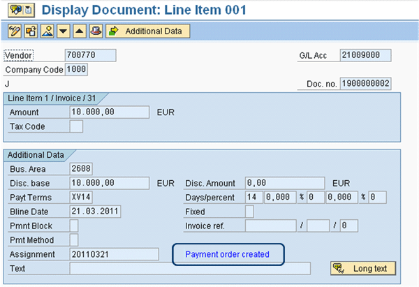 The invoice that has been paid remains open; in other words, it appears in the vendor open item list. When you go to the details screen of the original invoice (for example, using transaction FB03), you see Payment order created (Figure 4).