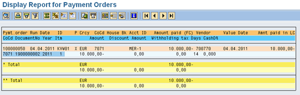The maintenance of the number ranges completes the configuration for using payment orders in automatic payments. You now run the payment run — transaction F110 — for payment methods using payment orders. There is no difference between using F110 for payment methods with payment orders and using F110 for payment methods without payment orders, but the result will be different. When you use payment orders, no postings are generated, and the logging indicates that a payment order was created (Figure 3).