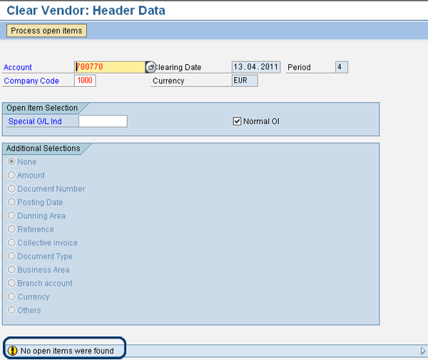 If you do not make any additional selections, the system warns you that no open items were found (Figure 6). Be aware that if there are unpaid open items, these open items are selected, but the open items paid by payment order are not selected.
