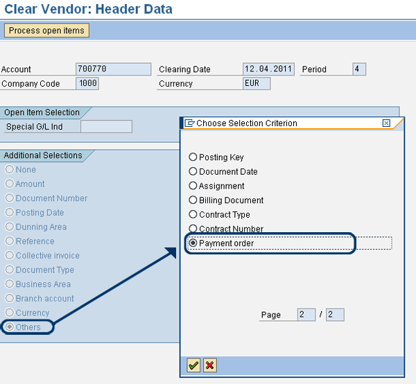 In the standard SAP system the option to use payment orders as a criterion for clearing has not been configured. The standard option to select payment orders is not available. Via Customizing you must add this option. You can do this via the transaction O7F1 or via the Customizing menu Financial Accounting > Accounts receivable and Accounts Payable > Vendor Accounts > Line Items > Open Items Processing > Choose Selection Fields. Press the Insert after. . . button to add the field PYORD, and save your entry by clicking the save icon