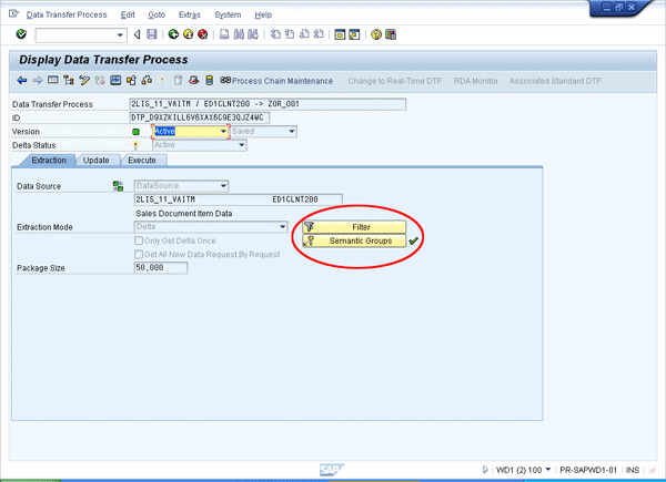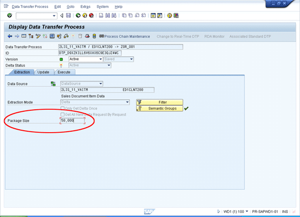 In most data loads, the contents and grouping of the data into packages is not relevant. The system chooses the first package, loads this package, then the next. The contents of the packages are based on the contents of the source data. The system is careful to cut off the data when the package size limit is reached. In order to see the package size, double click on the data transfer process (DTP) and go to the Extraction tab. (Figure 1).