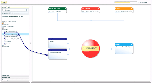 In the first phase, you can add the new driver to the risk, using the drop-down functionality.We add Commodity Prices as a driver for the risk of money loss over P2P because we think that unexpected changes in commodity prices can reduce a producer’s profit margin and make budgeting difficult. Therefore, a driver for a specific risk is the cause of the risk that generates an effect (e.g., operational direct costs increase).
