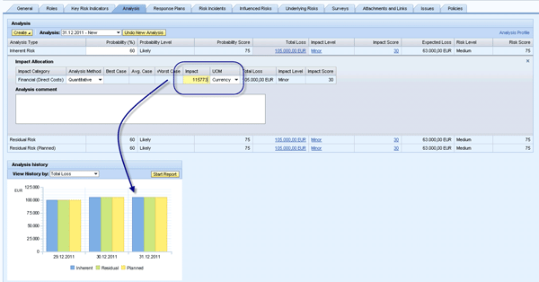 If you insert an inherent risk probability of 60 percent and an impact of 115.773 euros, the system updates the total loss in the analysis history graph to 105,000 euros. As you can see in Figure 12, the inherent, residual, and planned total loss levels are the same because as of December 31, 2011, no remediation plans were put in place.