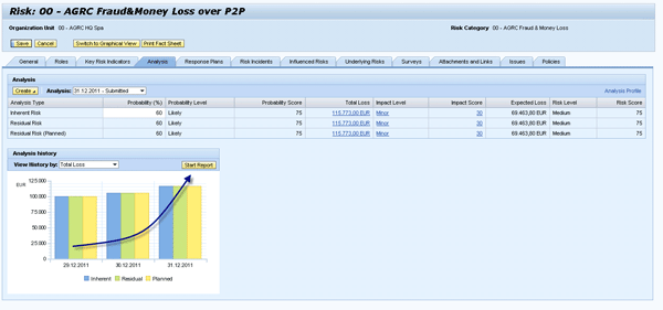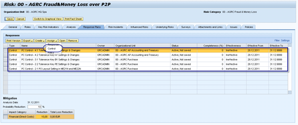 SAP GRC 10.0 helps your risk management department put in place on-time risk responses. It enables you to link proactively to internal audit, security, Project System, plant maintenance, and departments in which a risk could occur. This approach provides visibility to the business and stakeholders of cost reductions when different types of controls are put in place to remediate problems quickly. With SAP Risk Management 10.0, when you put in place a risk response, you can evaluate cost reduction using a risk analysis history report and analyzing expected loss trends during a different time period. If the risk response (i.e., mitigation control) is effective, the cause of the risk is eliminated or mitigated, so the expected loss related to residual risk is reduced after a mitigation control is implemented correctly.