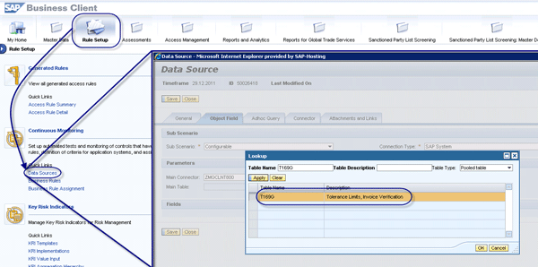 The information related to tolerance key PE is stored in table T169G of the SAP back end. As shown in Figure 23, the data source that is used to implement the automated control in SAP Process Control 10.0 uses this table for the analysis. To customize the data source, you need to select the tab named Object Field. Select a sub-scenario type (e.g., configurable if you want to control specific table changes), the main connector (e.g., ZMGCLNT800, the physical connector to the SAP back-end system on which the table you need to control resides), and the main table (e.g., T169G).
