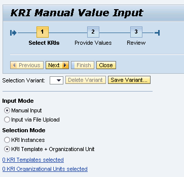 Now we show you the procedure to insert a KRI in SAP GRC 10.0 manually . To create a new KRI, follow menu path Rule Setup > Key Risk Indicators > KRI Value Input. For technical reasons, you first need to retrieve an XML template for your KRIs implemented in the system. Select the KRI as shown in Figure 3. Select Manual Input in the Input Mode section and KRI Template + Organizational Unit in the Selection Mode section. Click the Next button.