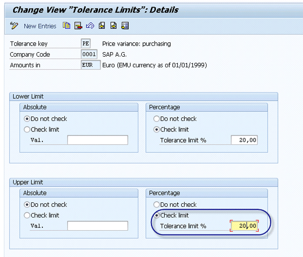 You can check the Tolerance Key PE Settings, as shown in Figure 32, by following menu path SPRO > Material Management > Purchasing > Purchase Order > Set Tolerance Limits for Price Variance.