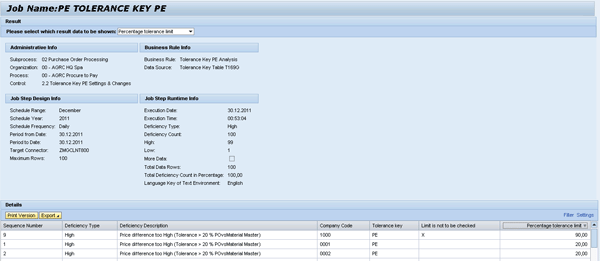 Because the Business Rule Deficiency value is designed and implemented, we expect that if the Tolerance Limit PE is set to 20 percent for the company 0001 (Figure 32), the deficiency type associated to the issue that the control owner automatically receives is high.