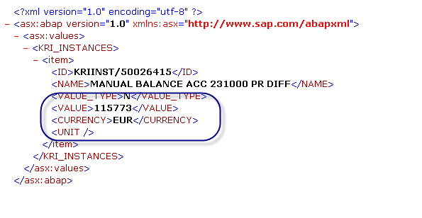 Using a simple XML editor program, you can change the value of the KRI in the tag <VALUE> … </VALUE>. Figure 6 shows the final XML file to be downloaded in the GRC system to update the KRI value (115.773€) related to the balance of the G/L account 231000 loss price variance. This value has to be updated because it changes every month and represents the money loss linked to the risk.