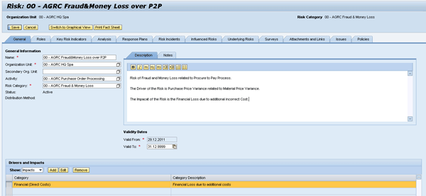 To create a new risk in SAP GRC 10.0, follow menu path Work Center Assessments > Risk Assessments > Risk and Opportunities. Figure 9 shows an implementation example of the operational risk fraud and money loss over P2P. The risk is linked to the organization unit 00 – AGRC HQ Spa and the impact related to the Y is financial loss owing to additional costs.