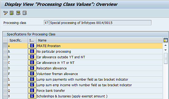 To minimize PCR modifications with each new wage type that needs to be prorated, you create a new processing class specification under processing class 47 and add it to the rule. The first step is to create the new processing class specification in table V_T52D2. This new specification can then be used by any wage type that needs to be prorated using the PRATE function. In Figure 1 you can see the newly created specification “&” sign that was created under the processing class 47 entry.