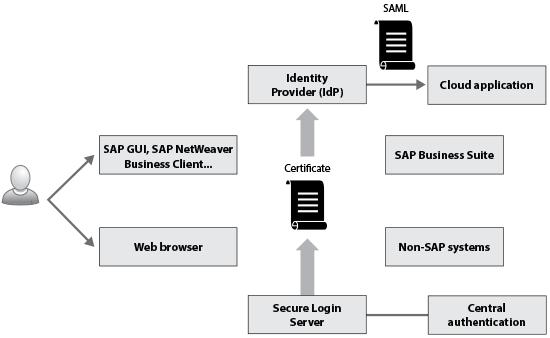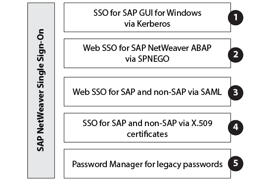 The use of each component is determined by the system landscape as well as by the requirements of the IT and business departments. The components can be implemented in any combination based on individual requirements. For example, you can use SSO with Kerberos integration, certificates, or Security Assertion Markup Language (SAML).