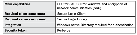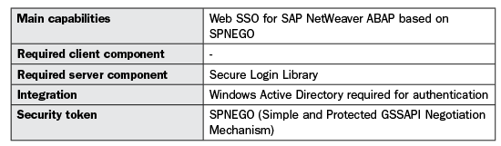 The main use case of this component is to enable SSO for SAP GUI for Windows (Table 1). It is a simple deployment, but has limited support of client technologies. Technically, it reuses the existing Kerberos authentication token on the client side (Microsoft Active Directory) for the SAP landscape. Secure Login Client integrates with SAP GUI for Windows, analyzes the existing security tokens, and transfers them to the SAP system. On the server side, Secure Login Library reads Kerberos-based authentication tokens and integrates with the authentication layer in SAP NetWeaver ABAP. In SAP NetWeaver ABAP each user needs to be mapped to the Microsoft Active Directory account. Otherwise, the authentication layer does not accept the Kerberos authentication token.