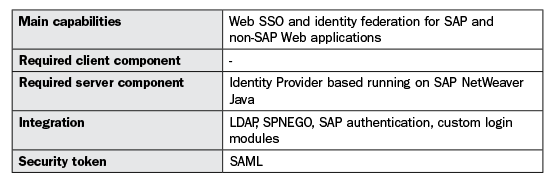 Web SSO and identity federation are based on the public SAML standard. SAP implemented the standard (Table 3), which is ideal to support heterogeneous system landscapes. There are two main components: SAML Service Provider (SP) and SAML Identity Provider (IdP). IdP is a kind of central component for authentication that can issue SAML assertions to authenticate against a Web application server (AS), such as SAP NetWeaver ABAP, SAP NetWeaver Java, or non-SAP Web application servers. The IdP is delivered via SAP NetWeaver Single Sign-On and is running on an SAP NetWeaver Java server itself. The application server has to support the SAML standards as a SAML SP. SAP NetWeaver Java supports SAML as an SP since version 7.2 and SAP NetWeaver ABAP since version 7.02. SAML is often used in combination with extranet and partner integration scenarios.