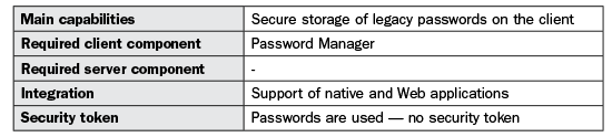 The Password Manager enables you to securely store the remaining legacy passwords. It is a local client and currently available for Microsoft-based operating systems. In Table 5 you see no security token in relation to the password manager, because the focus of this component is to store remaining passwords. The main goal of an SSO implementation should be to replace the transfer of passwords (components 1-4) with a security token.