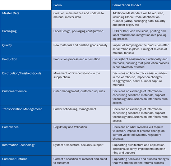 Serialization cannot operate as a silo initiative or application. In order to benefit the enterprise beyond simple compliance and add business value to the organization, the implementation of serialization must touch and consider almost every point in the supply chain.