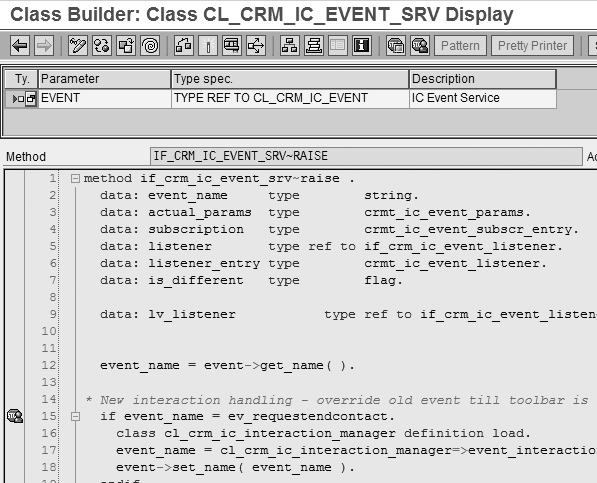 Step 1. Set an external breakpoint. Do this in the method RAISE of class CL_CRM_IC_EVENT after the call to the get_name method of the event. This breakpoint should break whenever IC WebClient triggers an event (Figure 1). Then start IC WebClient.