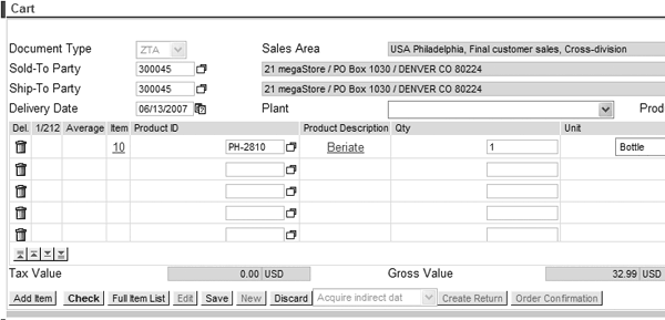 Use the IC WebClient Workbench transaction BSP_WD_WORKBENCH to copy the ERPCart view from the CRM_IC BSP application to the ZCRM_IC BSP application under the same name. Then use transaction SPRO and follow IMG menu path Customer Relationship Management>Interaction Center WebClient>Customer Specific System Modification>Define IC WebClient Runtime Profiles (Figure 8). Select your runtime profile and click on Controller Substitutes. Click on the New Entries button to create a controller substitute. Substitute controller CRM_IC ERPCart with ZCRM_IC ERPCart.