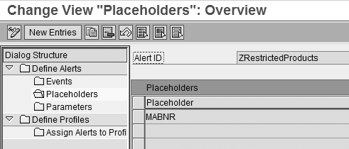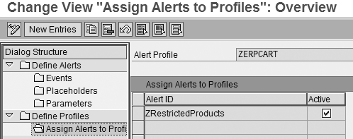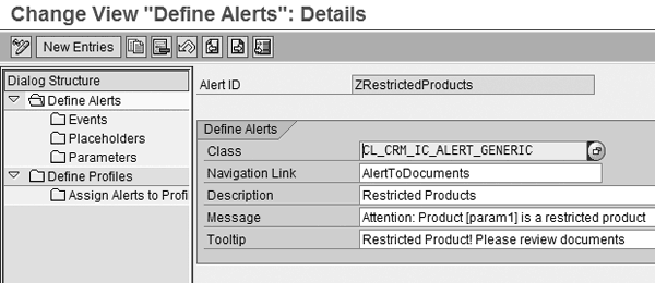 Step 1. Define a new alert in the IMG called ZRestrictedProducts. Use transaction SPRO and follow IMG menu path Customer Relationship Management>Interaction Center WebClient>Basic Functions>Define Alerts and Alert Profiles. Click on the New Entries button and enter the Alert ID ZRestrictedProducts (Figure 4).