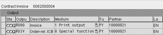 Output processing: The configuration results in the system populating output type RDIV in the external customer billing document. Display the billing document via transaction VF03. From the overview screen, follow Goto>Header>Output (Figure 12). Initially, output type RDIV has the ready-to-process status (indicated by a yellow circle). When successful processing is completed, the green square appears in the Sta... (status) field.