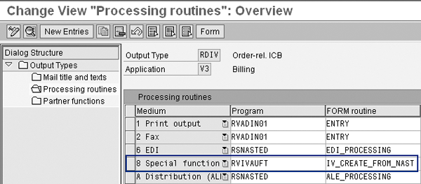 Next, click on the Processing routines folder in the Dialog Structure in Figure 6. In the screen that appears, enter program RVIVAUFT for the Medium (transmission medium) 8 Special function so that SAP ERP calls the processing program (Figure 7). Refer to SAP Note 728993 (Output type RDIV is missing in the standard system) for more details.