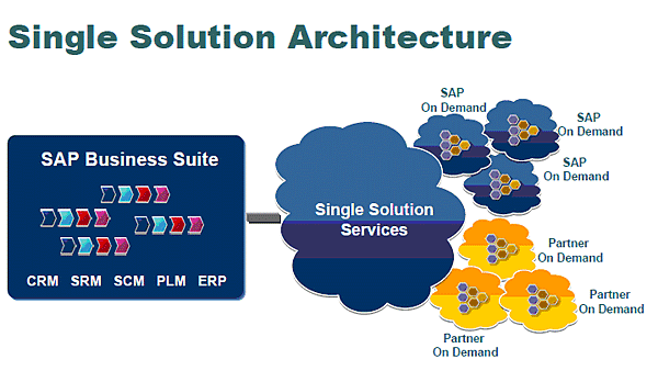 SAP’s on-demand applications would connect directly to a customer’s SAP ERP system in order to share data and processes with the full range of a company’s on-site SAP landscape. The strategy is based on a “single solution architecture,” in which multiple SAP and partner on-demand offerings can be managed from a single Web-based entry point (Figure 1).
