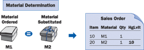 - Product substitution: During sales-order processing, material determination enables the automatic substitution of materials in a sales order. For example, during a holiday promotion, you want to send a product with a special wrapper. When the customer orders the product, the R/3 system substitutes the special product. You create the product with the special wrapper as a sub-item to the product the customer ordered (Figure 1).