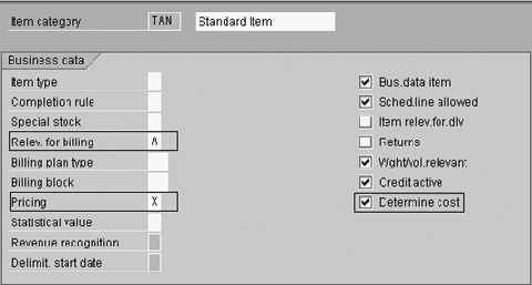 - Pricing: The pricing checkbox determines whether pricing calculations are carried out. If the checkbox is marked with an X, item category TAN is relevant for pricing, and the customer is charged. A free-of-charge product should not be priced. Item category TANN is typically used for free items.