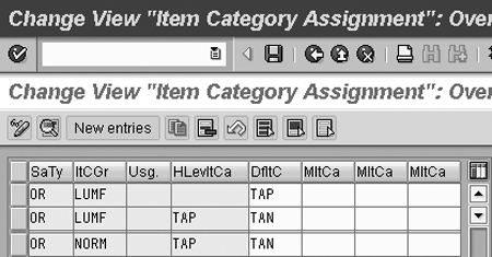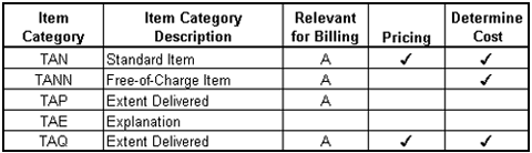 Item category, a configuration in the Sales and Distribution (SD) module, is assigned to every sales order item. (See the table below for some common item categories.) Item category controls how the item is processed, such as type and scope for inventory postings, transfer requirements, pricing, billings, and credit control checks.