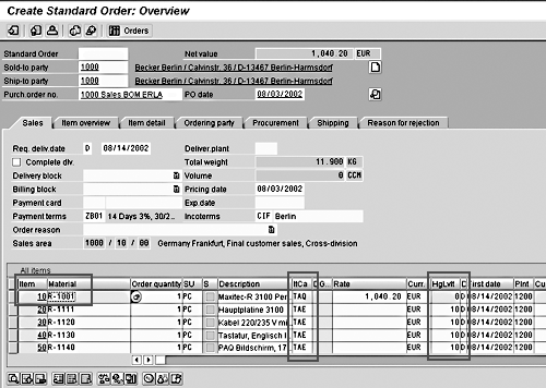 In the example of the sales BOM, the main item (sales order item 10) is assigned as item category TAQ and the components (sales order items 20 onwards) are item category TAE. All the sales order items are processed according to their respective definitions of item categories.