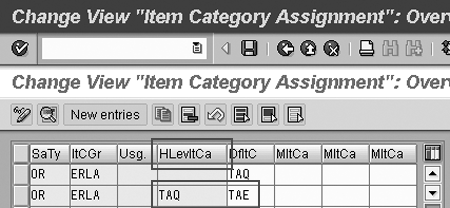 Item category TAQ designates the main item, as shown in the first row of the configuration. The sub-items are assigned to the main item. Therefore, the components are item category TAE. (In R/3, TAE is a dummy item category, not relevant for pricing or costs.) Here’s how to read the second row in the table: If the higher-level item category is TAQ, then you assign TAE to lower-level items, if they exist.