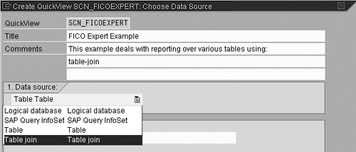 Step 1: Give your QuickView a name (free format) and choose your data source. You have the following four choices for the data source: