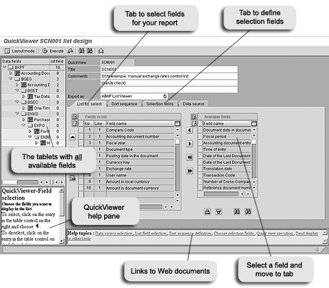 Step 2: Select and define fields. Field selection and the definition of selection fields are easy once you have found the right logical database. On the respective tabs, select the values you need and move them from the selection list into the tab by clicking on the arrows between the lists. (See Figure 2, which shows the List fld. select where you select the fields that appear in the final report.)