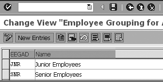 Double-click on the first row, Employee grouping for account determination: Define values. This brings up the Employee Grouping for Account Determination window (Figure 2). Click the New Entries button to enable the entries columns and enter the Employee Grouping for Account Determination (EEGAD), in my example JNR and SNR, and their definitions. Click the save icon.