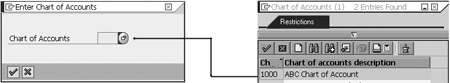 Step 5. Assign the symbolic account to G/L accounts through the chart of accounts. Enter transaction S_AHR_61010644 or follow the IMG menu path Payroll > Payroll: International > Reporting for Posting Payroll Results to Accounting > Activities for AC System > Assign Accounts > Assign Expense Accounts. Click the execute icon to display the Chart of Accounts selection screen (Figure 10). Enter the appropriate chart of account or click the select icon in the left window of Figure 10 to get a list of existing charts of accounts. In this example 1000 ABC Chart of Account is selected. Click the enter icon (a green check mark). Entering the Chart of Accounts calls up the FI Configuration window shown in Figure 11.