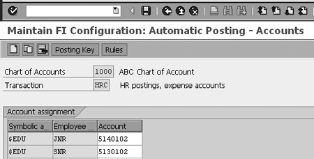 Define the symbolic account $EDU and corresponding G/L accounts from Table 2 (5140102 for JNR and 5130102 for SNR) as shown in Figure 12 and click the save icon. Note that the system enters the Transaction as HRC automatically because you already chose to assign expense accounts (see the IMG menu path of step 5). The transaction key is assigned by the account chosen for assignment.For example, if you choose balance sheet accounts, the transaction key HRF automatically defaults.