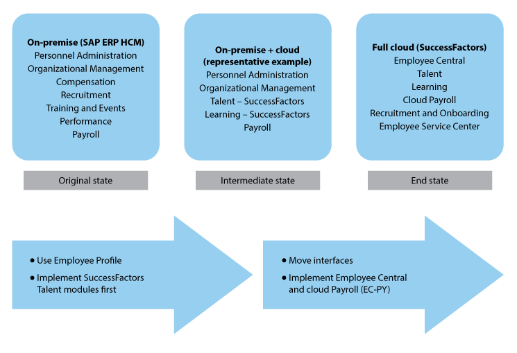 Scenario 1 – Transitioning all SAP ERP HCM on-premise applications and modules to a cloud HR system. This scenario covers the options for moving all on-premise modules such as core HR (typically employee master data with associated organization structures), Talent, Compensation, Payroll, Benefits, and Time Management to the cloud. I discuss the available functionality in the cloud and the options that are available. (You need to continue to check release notes since SAP continues to enrich the functionality with every quarterly release.)